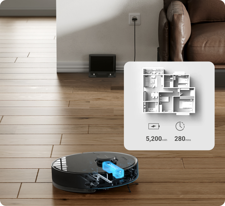 280 dəqiqəyə* qədər fasiləsiz təmizləmə təmin edən 5,200 mAh batareya ilə küncdən küncə təmizləmə əhatəsindən həzz alın.Enerji azaldıqda, robotunuz avtomatik olaraq doldurulmağa qayıdır və sonra bütün evinizin təmizlənməsini təmin etmək üçün təmizliyi qaldığı yerdən davam edir.