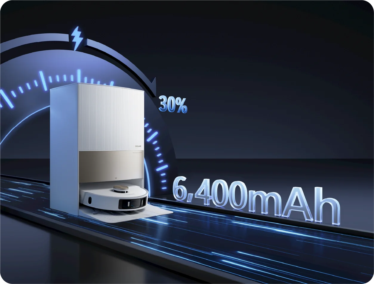 Dreame-nin qabaqcıl texnologiyası robotunuzun növbəti təmizləmə seansına tez hazır olmasını təmin etmək üçün böyük 6400 mAh batareyanın doldurulma sürətini daha çox artırır.